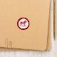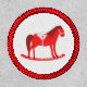 This awesome Christmas patch features a digital art image of a cute Scandinavian style rocking horse. The horse is red with a dark red mane, tail and hooves. The friendly horse is smiling. It has a white saddle and reins with pretty red Scandi folk style patterns on the saddle including the sun, moon and stars and hearts and flowers. The base of the rocking horse is red and is covered in pretty white leaves. The design was inspired by the Swedish Dala horse.