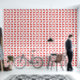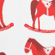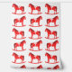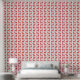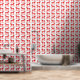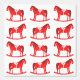 This awesome patterned Christmas wallpaper features a digital art image of a cute Scandinavian style rocking horse. The horse is red with a dark red mane, tail and hooves. The friendly horse is smiling. It has a white saddle and reins with pretty red Scandi folk style patterns on the saddle including the sun, moon and stars and hearts and flowers. The base of the rocking horse is red and is covered in pretty white leaves. The design was inspired by the Swedish Dala horse.
