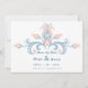 Inspired by the traditional Norwegian rosemaling painting style, this wedding save the date features a dusty blue swirl circular border design with blush flowers on a white background. The text portions of this save the date are customizable.