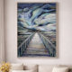 An atmospheric hand-painted Scandinavian landscape capturing a quiet wooden boardwalk leading into a vast Nordic horizon beneath a dramatic winter sky. Layers of cool blues, icy greens and moody grays create depth, movement, and a sense of introspection.