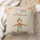 This stylish, Fall themed throw pillow features a warm and cozy, watercolor painting style image. A scarecrow is placed in the center at the bottom, with pumpkins at his feet. Beautiful autumn leaves and fall foliage frames the text area at the top. The phrase "Happy Autumn" is printed in a whimsical brown font above the scarecrow.