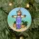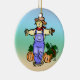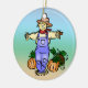 Cartoon farmer scarecrow surrounded by pumpkins on a multicolored ornament. Text and/or a colored background can be added to the reverse side. From Heard_ & 369.