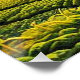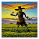 A.I .created print of a scarecrow dressed in a suit stands in the middle of lush vegetable fields under a vibrant sunset. The landscape stretches into the distance with rows of crops and a colorful sky filled with clouds