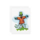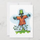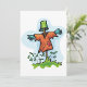 Don’t be scared it is just a scarecrow. They are designed to scare the birds away. This scarecrow has an orange top on and appears to be wearing a bucket on its head. It’s arms are outstretched and is is standing in some green grass. This scarecrow design looks great on these invitations