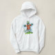 Don’t be scared it is just a scarecrow. They are designed to scare the birds away. This scarecrow has an orange top on and appears to be wearing a bucket on its head. It’s arms are outstretched and is is standing in some green grass. This scarecrow design looks great on this womens hoodie. Perfect for yourself or as a gift