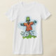 Don’t be scared it is just a scarecrow. They are designed to scare the birds away. This scarecrow has an orange top on and appears to be wearing a bucket on its head. It’s arms are outstretched and is is standing in some green grass. This scarecrow design looks great on this womens t-shirt. Perfect for yourself or as a gift