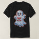 This Halloween T-shirt features a scared, cute ghost floating gently. The ghost has soft, rounded edges, and its droopy eyes and tiny frown give it a heartwarming, melancholic expression.