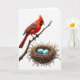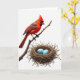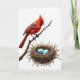Designed with a bright white background, the front shows a crested red bird perched on a thin, knotted branch near the upper left, its warm scarlet feathers touched with brown along the back. A dark face marking around the eyes and beak gives the bird a focused look, and its head tilts downward as if watching over something dear ❤️. Below and slightly right, a tightly woven nest of twigs and straw sits like a small cradle, adding cozy texture against the open space. Inside the nest rest two smooth, sky-blue eggs that bring a gentle spring contrast 🌼. The bird’s attentive posture and the careful spacing between branch and nest create a quiet, affectionate connection, like a protective glance shared between close companions. A short line of text appears near the top right in soft gray lettering, leaving the illustration to stay center stage. The lighting stays even and shadow-free, and the eggs are painted a clear blue with subtle highlights along their upper curves.