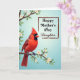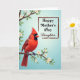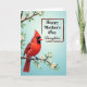The front design shows a scarlet-feathered bird with a fluffy crest and a dark face mask, its bright eye turned slightly as if sharing a gentle moment with the viewer ❤️. It perches on a slim, textured branch that feels steady and calm, like a quiet place to pause together. Creamy white blossoms with small golden centers cluster along the branch, paired with fresh green leaves that lean inward like a soft embrace. The flowers and foliage arc into the scene from the top left and bottom right, creating a natural frame that suggests closeness and care 🌼. Behind everything, a smooth gradient of pale blues resembles an open sky and gives the red bird plenty of contrast. In the upper right, a thin dark-brown outlined rectangle holds the message “Happy Mother’s Day Daughter,” set in dark lettering. The words sit centered inside the box, with the main greeting larger and the final word placed to read as a warm add-on. The background remains an airy wash of light blue that fades gently from one corner to the next.
