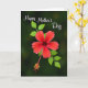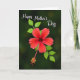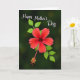 This card shows a single scarlet flower with five soft petals opening against a deep, leafy green background, like a quiet gift offered with affection ❤️. The bloom sits slightly off-center, drawing your eye the way two friends naturally lean toward each other in a close conversation. From the center, a long, slender stem reaches downward, tipped with tiny yellow pollen details that add a gentle sparkle of contrast. The lighting is soft and diffused, revealing faint veins and a velvety look on the petals while the surrounding leaves fade into a smooth, emerald blur. A few green leaves peek from behind the blossom, creating a natural frame that feels calm and intimate 🌼. In the upper left, a short message curves along the edge in flowing white lettering, standing out clearly against the darker greens. The mix of rich red, deep green, and warm yellow feels like a tender glance shared in a garden at dusk. The flower’s center shows clustered yellow tips beneath the petals, with the long pistil extending toward the lower portion of the design.