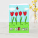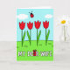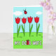 Designed with four scarlet flower blooms standing in a neat row, the illustration keeps shapes simple while still feeling affectionate ❤️. Slender green stems rise from a deep emerald strip along the bottom, where a few small grass marks add gentle texture like a shared walk through a garden. Above them, a wide cerulean sky stretches across the top half, softened by a couple of pale clouds that make the scene feel calm and close. Near the upper area, a small red, spotted insect with thin antennae hovers as if pausing to admire the flowers, adding a friendly, companion-like touch 🌼. Across the lower third, crisp white block lettering runs horizontally, set clearly against the green foreground. One letter in the phrase is replaced by a tiny wrapped rectangular gift in bright colors, topped with a bow, like a sweet surprise tucked into the words. The gift sits right inside the line of text, slightly taller than the letters around it, drawing the eye to the center of the message. The red blooms have rounded petals and sit evenly spaced, each bloom facing forward against the blue sky.