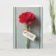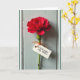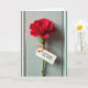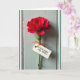 Designed with a single crimson flower as the focal point, the card features deeply ruffled petals in a velvety scarlet that feel like an affectionate embrace ❤️. The bloom sits against a softly muted backdrop of vertical wooden panels painted a cool grey-blue, giving the scene a calm, intimate setting. Gentle natural light falls across the petals, bringing out highlights on the folds and deeper shadows toward the center, like a quiet moment shared between close hearts. A slender green stem leads downward to a small cream tag tied on with rustic orange twine, adding a cozy, thoughtful touch. The message “To my beautiful Step Mother” appears on the tag in dark lettering, centered and easy to read, like a private note left with care. The twine loop and the small punched hole in the tag add subtle texture, while the smooth background keeps the focus on the flower and note. The composition stays simple and close-up, with the tag resting near the lower portion of the stem and the red bloom filling the upper area, accented by a tiny 🌼 detail in the soft lighting.