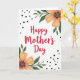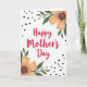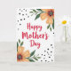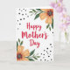 This greeting card features the words “Happy Mother’s Day” centered in bright red lettering, drawing your eye right away. The message sits on a white background that makes the red stand out, like a warm note meant for someone close ❤️. Soft floral clusters frame the design from the upper right and lower left corners, gently guiding attention back toward the middle. Each flower has peach-to-orange petals with a light, watercolor look, gathered around a darker center that adds depth. Deep green leaves spread outward in small branches, giving the layout a fresh, garden feel 🌼. Small black dots are sprinkled unevenly across the background, adding a light decorative touch without crowding the main text. The upper-right bouquet leans inward with layered petals and leafy sprigs, while the lower-left bouquet mirrors it with matching tones and scattered dots around the edges.