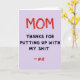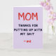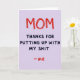 This card features a minimalist text-only design on a soft lavender background, with “MOM” stretched large across the top in bright red letters that look like they were drawn with a waxy crayon, giving it an intimate, just-for-you feel ❤️. The slightly uneven strokes make the word feel like it was written in a rush of affection, as if someone couldn’t wait to say it out loud. Underneath, the main message sits in dark charcoal, using rounded, easy-to-read lettering that keeps the layout calm and friendly. The wording is direct and a little cheeky, like a close relationship where teasing and gratitude sit side by side. The contrast between the loud red headline and the steadier dark text creates a gentle push-and-pull, like a warm hug followed by a knowing grin 🌼. Near the bottom, a small “- me” appears in the same red as the top word, tucked in like a quiet sign-off. The top word is centered high on the page, the longer charcoal lines are stacked beneath it, and the tiny red sign-off sits lower with extra breathing space around it.