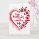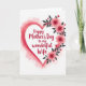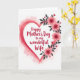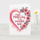 This greeting card features a large heart centered on the front, edged with soft brushy tones of rose and crimson that fade into a pale pink wash. Inside the heart, the message “Happy Mother’s Day to my wonderful Wife” sits in the middle in flowing red lettering that draws the eye ❤️. Along the right side of the heart, a cluster of layered blossoms in coral and fuchsia leans inward like a gentle embrace, with dark gray leaves and thin stems adding contrast. The open white background gives the design plenty of breathing room, letting the heart and flowers feel close and affectionate without crowding. Subtle paint textures in the heart’s border and the petals add a cozy, intimate look, like a note meant for someone you hold dear. A small 🌼 touch in the floral shapes helps the arrangement feel light and fresh while still rich in color. The flowers cascade down the right edge of the heart, with the darkest leaves tucked behind the brightest petals.