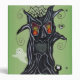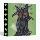 Image is from my original artwork. This scary, spooky, evil face black tree has glowing red flame eyes and a spiderweb with a cute little spider. A cute little ghost and scared black cat with big eyes are peeking out behind the tree. See my store Art by MAR for matching products with this design.