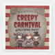 These spooky custom Halloween party napkins feature a creepy carnival theme. Three scary clowns are printed at the bottom. A vintage style parchment paper carnival poster is featured in the background, over a red and white striped pattern.