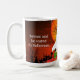 This Halloween coffee mug features a collage of a black cat in a spooky graveyard and a ghost. Each illustration used in this design was cut out from a photograph then was handset as an overlay. Use this mug throughout the Halloween season for daily drinkware or for a party.