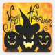 Three fun but scary Halloween pumpkin jack o lanterns with carved faces and a witches hat on a flame like red & yellow background. They are wishing you a Happy Halloween! May also include a spooky flame like Halloween moon with a jack o lantern all lit up and a spooky gnarled haunted house sitting in front of the moon. Old dead trees and a spider with lit up eyes add to the haunted effect.