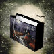 Halloween gift bag featuring a watercolor eerie Halloween scene with a haunted house and bats swirling above moonlit autumn landscape. Happy Halloween greeting in the upper right. Additional sizes available. Image may need to be adjusted for varying sizes.