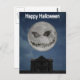 Scary Halloween illustration featuring a spooky landscape by night with the full moon having a jack-o-lantern face over a creepy dark old house.