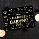 Announce your spooky Halloween pumpkin carving party and invite your guests with our scary jack-o-lantern carving pumpkin faces. Our design features different glowing scary pumpkin carving faces peeking through the darkness in gold foil. Bats and waxed candles add to the scary Halloween invitation. The reverse side features the spooky Halloween pumpkin carving faces with the details of Halloween placed in the center. All illustrations contained in this spooky Halloween pumpkin carving invitation are hand-drawn original artwork by Moodthology. You can customize the text size, text color, font, and layout for your own personal design preference.