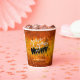 Creepy branches stretch across a haunted house that looms from a foggy night sky, dotted with black bats and grinning pumpkin faces. Bold typography of 'Scary Scary Night', along with your own name and message (we've added 'eat, drink & be wary' as an example) on this colorful paper cup, adds the finishing touches for a Happy Halloween. Search ID946 to see other products and color options for this scary Halloween design.