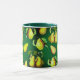 Coffee mug in a print of scattered pears and leaves, adapted from vintage botanical art, on a deep emerald green background