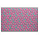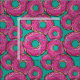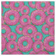 A fun and adorable fabric featuring scattered pink donuts of various sizes on a turquoise backdrop.