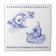 A delightful toile-inspired ceramic tile in blue willow colors featuring playful kitty cats romping in a bathroom.
