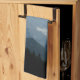 Kitchen towel with a photograph of beautiful mountains, cloudy sky, and rolling hills filled with trees in the foreground. Gray blue color scheme.