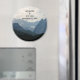A wedding magnet with a photograph of beautiful mountains, cloudy sky, and rolling hills filled with trees in the foreground. Gray blue color scheme.