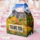 A tiny favor box with a beautiful country photograph. Mountains of stone with an autumn forest in bright colors. A quiet lake reflects the mountains, trees and grasses.