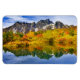 Magnet with a beautiful country photograph. Mountains of stone with an autumn forest in bright colors. A quiet lake reflects the mountains, trees and grasses.