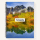 Spiral notebook with a beautiful country photograph. Mountains of stone with an autumn forest in bright colors. A quiet lake reflects the mountains, trees and grasses.