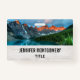 Name tag with a beautiful photograph featuring a beautiful mountain range, gray and rust colors. A green lush forest surrounds a calm clear lake. Gorgeous outdoorsy image. Name and title written on a wooden texture image for a rustic flair.