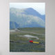 Photography poster with view from the summit of Mt. Washington in New Hampshire. The cog railway train can be seen traveling down the mountain and the auto road is in the distance. Also more tall mountains in the Presidential Mountain Range are in view.