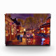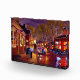 Scenic view of St. Charles Missouri National Historic District in early evening as people gather to dine in it’s many restaurants and bars. Colorful reflections are seen in the wet cobblestone streets along the many Greek Revival, Late Victorian, Italianate buildings.