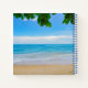 A personalized notebook with a landscape photograph of a tropical beach. Warm sand, azure water and blue sky with tropical leaves along the top.
