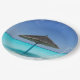 Paper plates with a photograph of a scenic tropical caribbean beach.. A white sandy beach and crystal blue waters with a solo thatched umbrella. Secluded and serene.