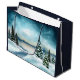 A large gift bag with a beautiful watercolor painting. Pine trees covered with snow in a wintery scene. Snowflakes falling down on a snow-covered ground. White and blue fluffy clouds up in the sky. With a frozen lake in the background. Peaceful moody vibe.