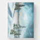 Wooden box art with a beautiful watercolor painting. Pine trees covered with snow in a wintery scene. Snowflakes falling down on a snow-covered ground. White and blue fluffy clouds up in the sky. With a frozen lake in the background. Peaceful moody vibe.