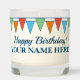 Scented Happy Birthday candle gift with custom name. Colorful pointy triangular bunning flags design for friends and family. Add your own personalized name and greeting. Also great for other occasions and celebrations. Create a candle for coworker, employee, boss, mom, dad, husband, wife, kids etc.