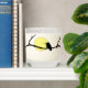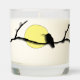Silhouette of hummingbird on bare tree branch. Drop shadow enhances image against a yellow circle depicting the sun. Image is mirrored on opposite side.