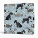Cute Schnauzer dogs in black, salt and pepper and black and silver coats sit, stand and rollover with scattered dog bones and paw prints on a light blue background.