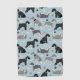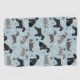 Cute Schnauzer dogs in black, salt and pepper and black and silver coats sit, stand and rollover with scattered dog bones and paw prints on a light blue background.