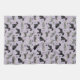 Cute Schnauzer dogs in black, salt and pepper and black and silver coats sit, stand and rollover with scattered dog bones and paw prints on a light purple background.
