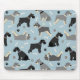 Cute Schnauzer dogs in black, salt and pepper and black and silver coats sit, stand and rollover with scattered dog bones and paw prints on a light blue background.
