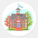 School buildings come in all styles. This design is a cool looking school building that is an old small cottage type. The building looks cute and has a bell tower at the top of the roof. This school building design looks great on these stickers. Perfect for yourself or as a gift