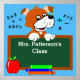 Personalized elementary school classroom poster of a cartoon dog holding a chalkboard printed with name of teacher. Apple and books in front of blackboard. Customize text and background color.